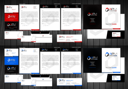 We are a family owned business with 90+ years in the construction and real estate sector and would like to present our company as a quality, professional organization with a sleek modern set of stationary. Stationary design A: Company name: APM Construction Services, LLC Optional Tagline: Working from experience, not for it! Color Mode: RGB color Grey :R=149 G=149 B=149 White: R=255 G=255 B=255 Black : R=0 G=0 B=0 Blue : R=0 G=97 B=240 jsmith@apmcontractor.com (Design A) For: APM Construction Services, LLC Stationary design B: Company name: Assured Property Management, LLC Optional Tagline: Assured Accuracy, Assured Commitment Color Mode: RGB color Grey :R=149 G=149 B=149 White: R=255 G=255 B=255 Black : R=0 G=0 B=0 Red : R=209 G=0 B=0 jsmith@apmrentals.com (Design B) For: Assured Property Management, LLC Phone, email, and name will change for the additional members of the company. We also want an electronic email signature, and digital stationary template (MS word). Stationary and envelopes should tie in the theme of the business cards for a uniform look. Also looking for a Header only version of the stationary, as well as a full page version (header and footer used for design).