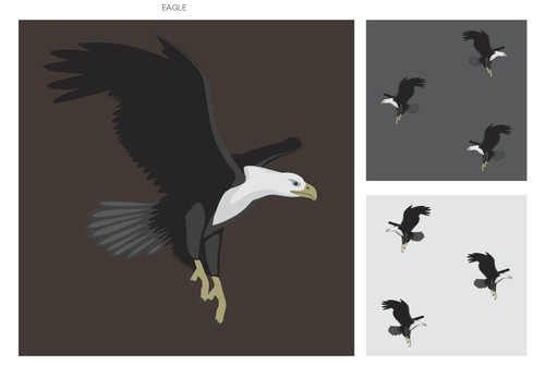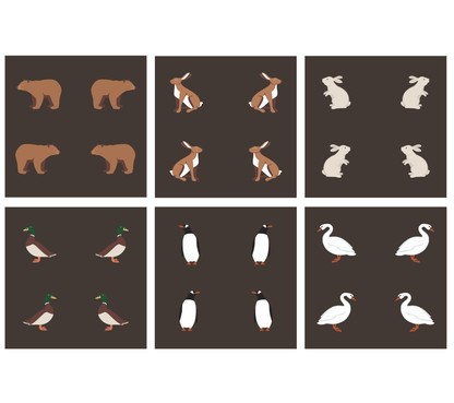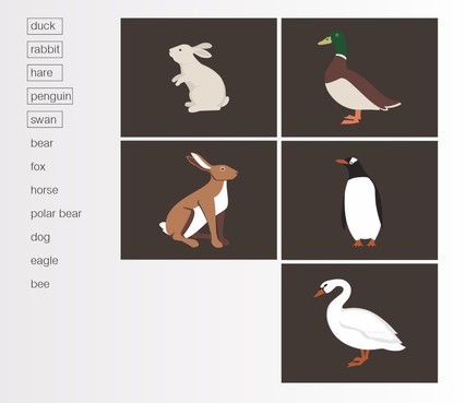 Eagle, Horse, hare, duck, bear, dog, rabbit, fox, bee, swan, polar bear, fox, penguine