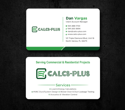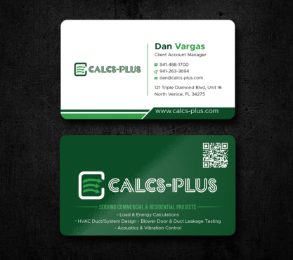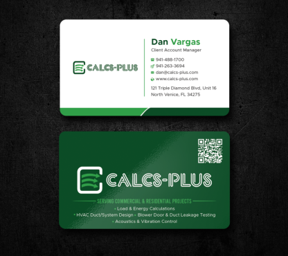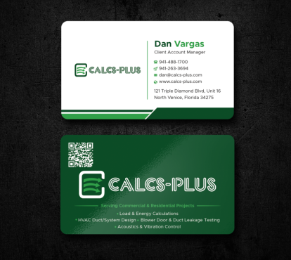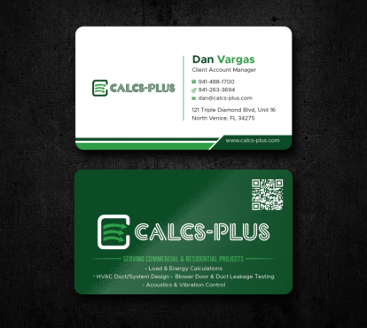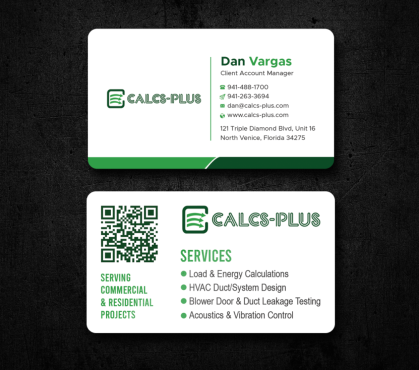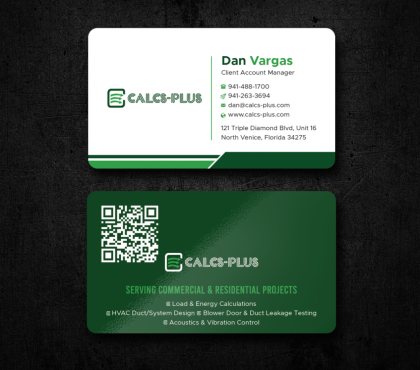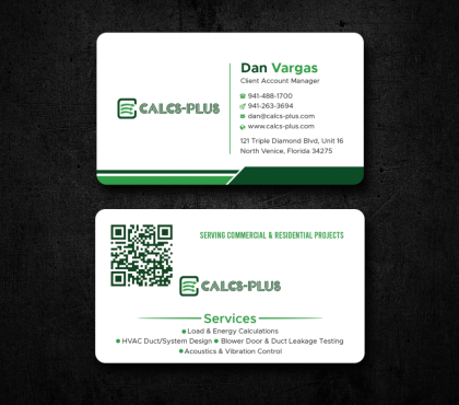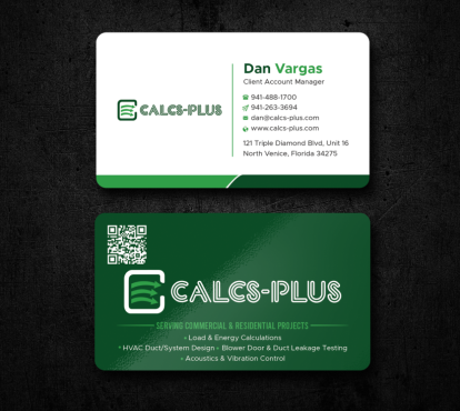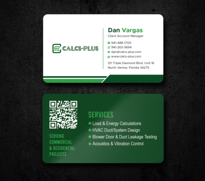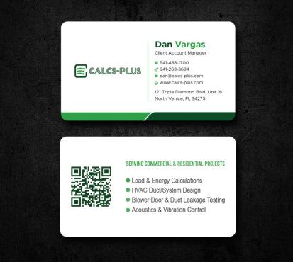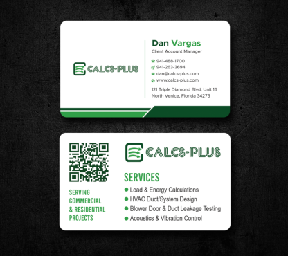Back Side of Business Card: QR code: attached 2000 x 2000 pixels, dark green on white & white on transparent. Size it to 0.8 to 1 inch for easy scanning. Keep at least 2 mm clear space, Services: Commercial & Residential Load & Energy Calculations HVAC Duct/System Design Blower Door & Duct Leakage Testing Acoustics & Vibration Control