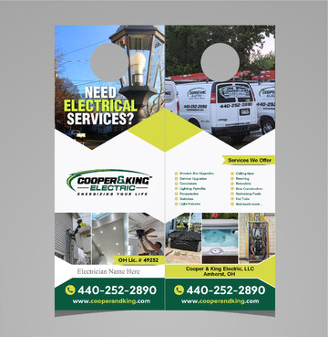 1. Must have the same feel as our logo and business cards. See attached files. 2. Must have a place for our electricians to write their name on the door hanger.