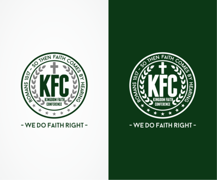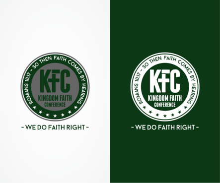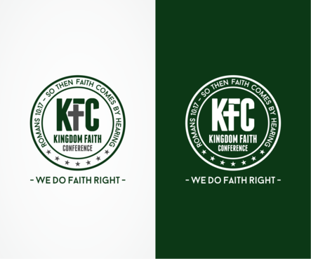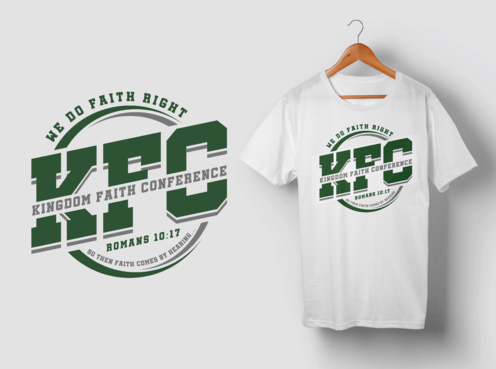 The design should be enclosed in a circular shape (like a stamp / emblem) The following should be inside of the circle: 1. KFC (please use this acronym). The acronym should stand out 2. Please spell out the acronym in a creative way on the shirt: Kingdom Faith Conference 3. Romans 10:17 – So then faith comes by hearing….. The following should be outside of the circle: 4. We do faith right Please NO CLIP ART and nothing that looks like clip art. The design should be modern and corporate in appearance.