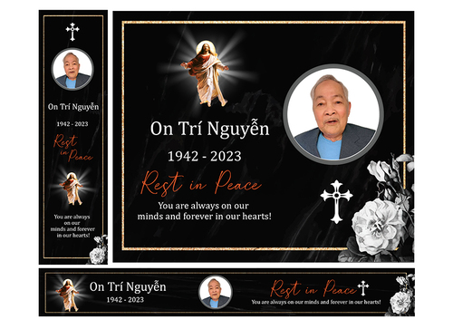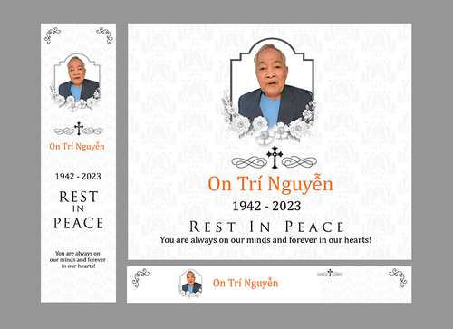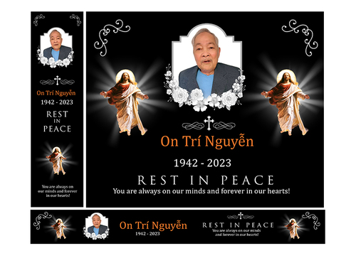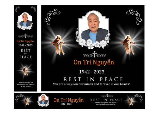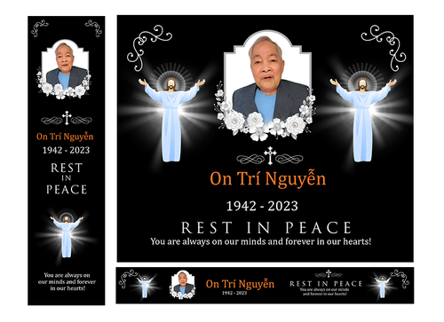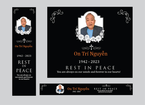 Below are details need to be included in the banners. Please use upload photo for this funeral banner On Tri Nguyen 1942 - 2023 Rest In Peace You are always on our minds And forever in our hearts! Please use cross sign (catholic logo) for this banner and border as well After the winner is selected, please duplicate the exact banner into 4 banners with different dates as follows: 1942-2023 Rest In Peace 1942-2024 Rest In Peace 1942-2025 Rest In Peace 1942-2026 Rest In Peace Thank you!