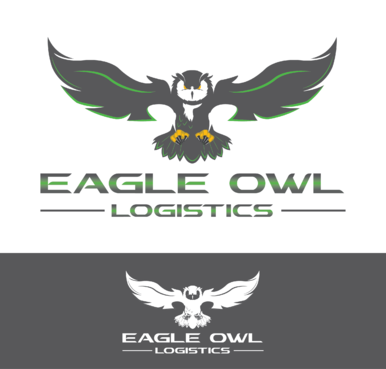 A large Eagle Owl either coming in for the kill or taking off with colors of dark grays, lime green, maybe a hint of yellow somewhere and whatever other colors. do something fun with the eyes. This logo will be on Websites and on the side of 18 wheelers