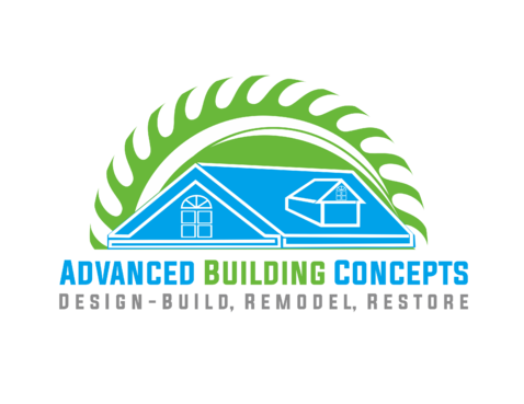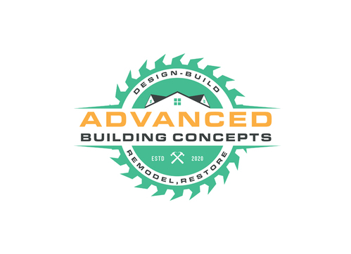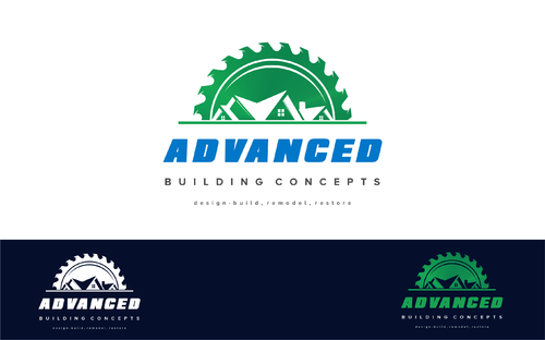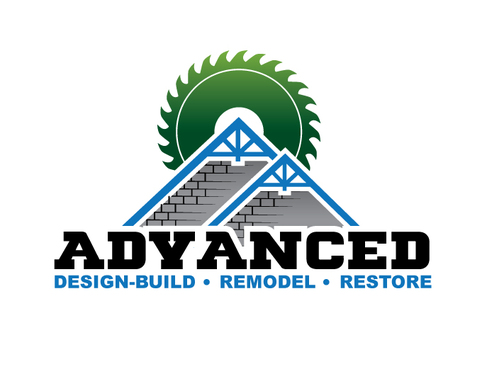 Want stylized or realistic sawblade semi circle in solid gradient green perhaps, with the shadow of a house having one Large primary gable on the left in 12x12 pitch and one smaller secondary gable to the right across the blade, The word advanced in a complimentary font and color under the half blade, with my tagline under that in smaller font
