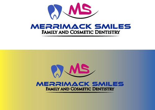 I would like a creative twist on a molar tooth and/or toothbrush with some depth of design to make it "pop" visually, possibly to the left of the wording. Maybe having the toothbrush with toothpaste on the bristles overlying the molar at an angle. The practice name Merrimack Smiles in fancy writing with the first letters, "M" and "S", larger than the other letters to make them also "pop" visually, possibly to the right of the logo. The wording of Family and Cosmetic Dentistry in smaller lettering below the practice name and seperated by a line. I want a clean, classic look with a modern, creative twist represented in a color scheme that is visually attractive and soothing. The design should appeal to parents in a smaller community area of southern New Hampshire as we are a family dental practice that treats people of all ages from 1 year of age to the elderly. We are also a cosmetic dental practice so a modern, clean and attractive design will appeal to these patients.