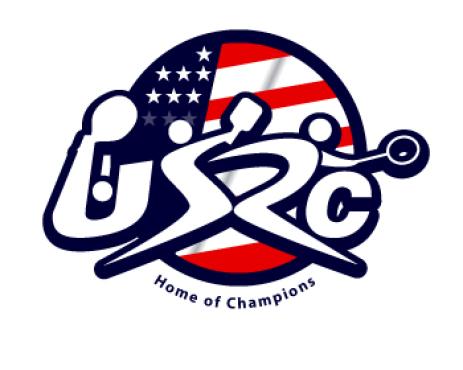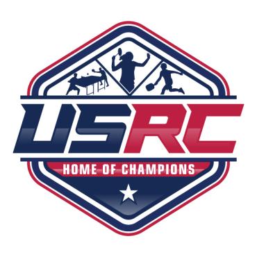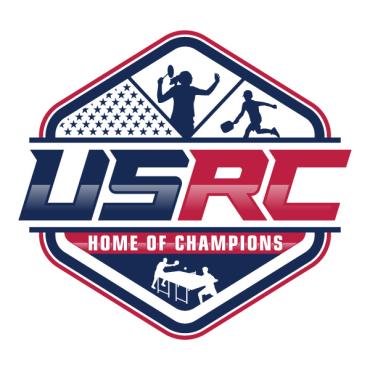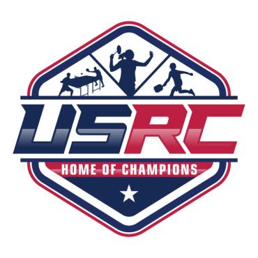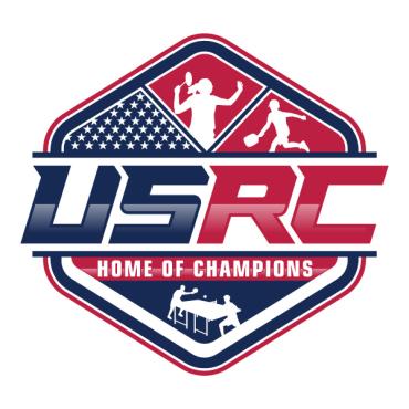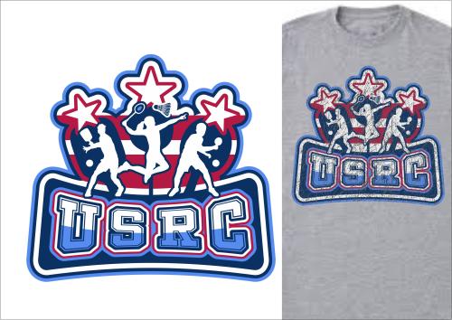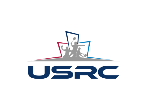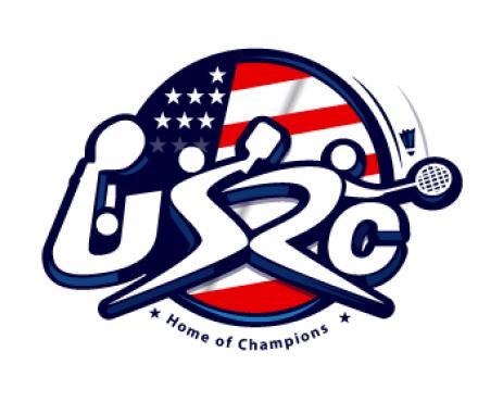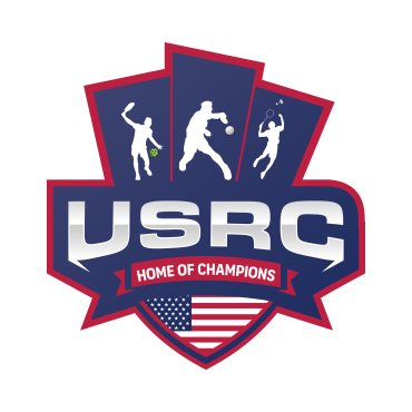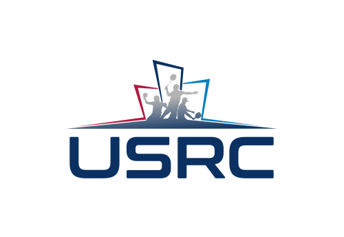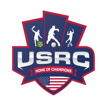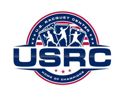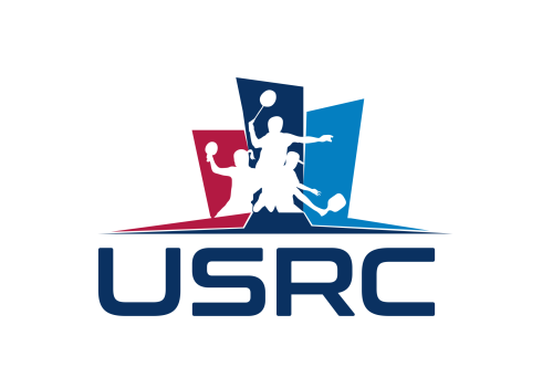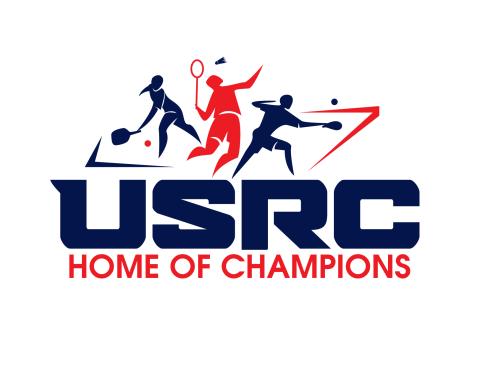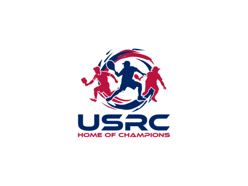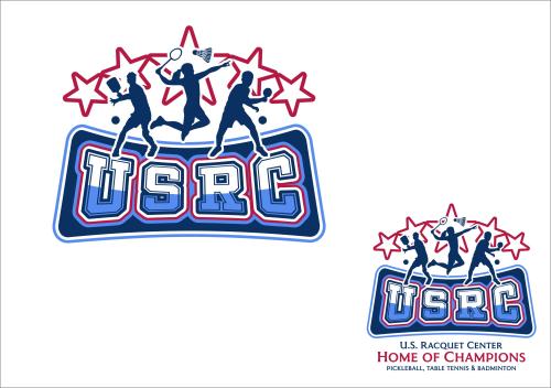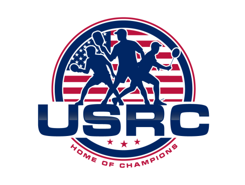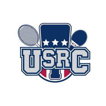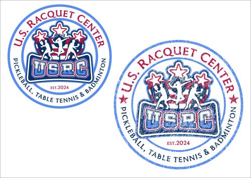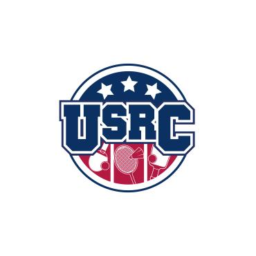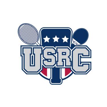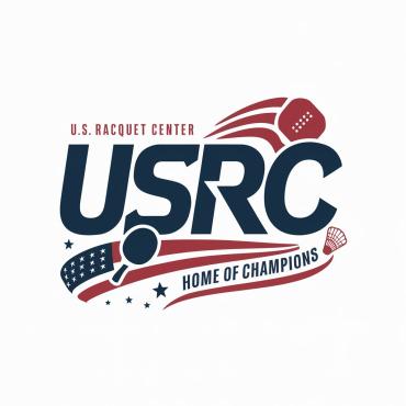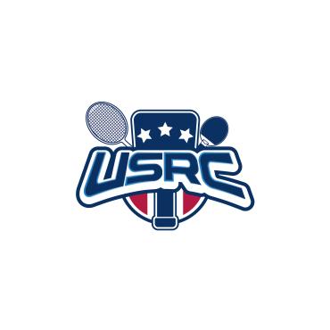 We are a sports facility based in the United States, named U.S. Racquet Center (USRC). Our facility offers courts for pickleball, table tennis, and badminton, catering to both kids who train and adults who play for fitness. The logo should prominently feature the initials 'USRC' and incorporate the color scheme of the USA flag, utilizing shades of red and blue to reflect our American identity and the spirit of sportsmanship. The logo should feature elements of these 3 sports.