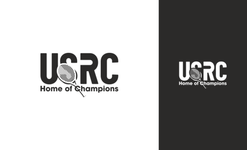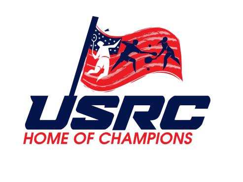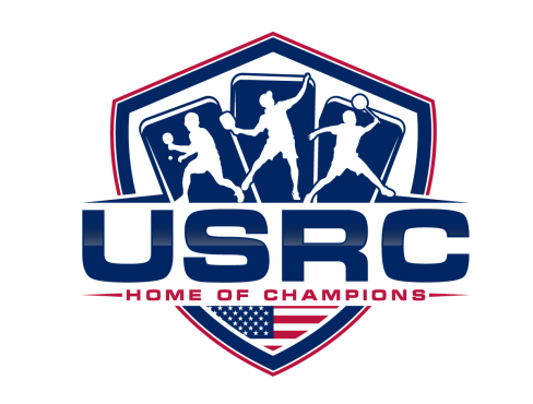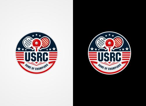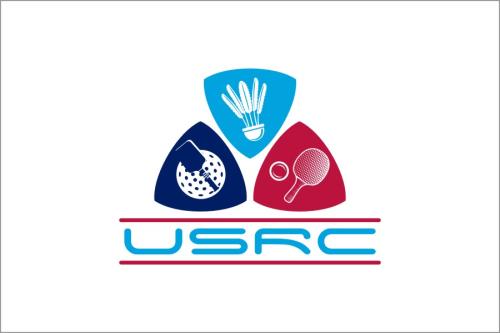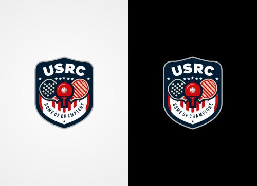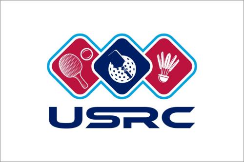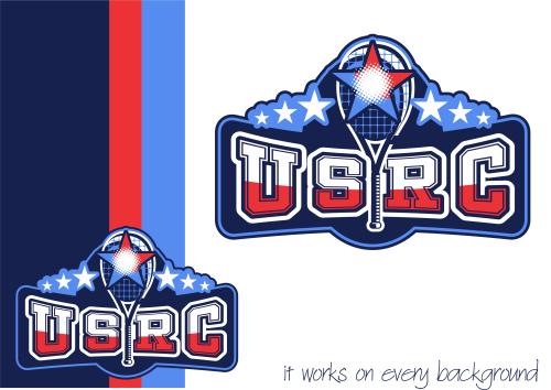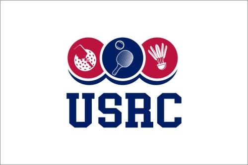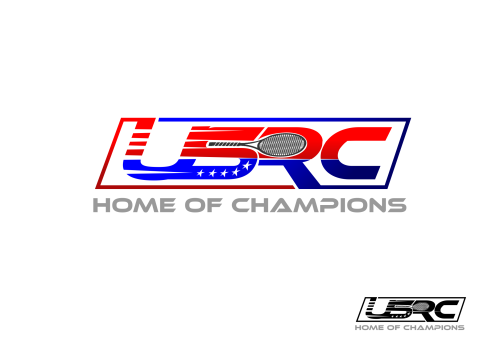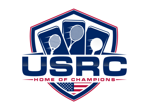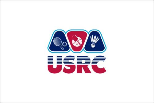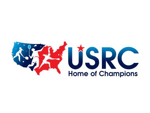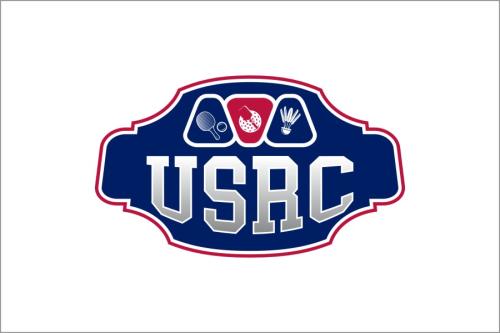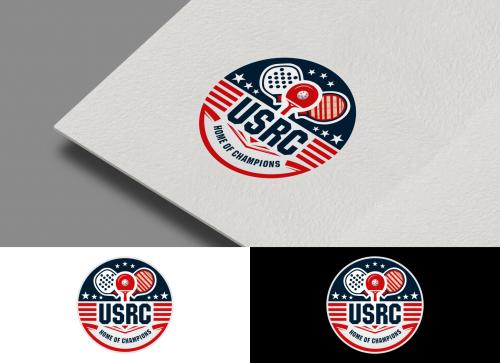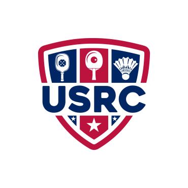 We are a sports facility based in the United States, named U.S. Racquet Center (USRC). Our facility offers courts for pickleball, table tennis, and badminton, catering to both kids who train and adults who play for fitness. The logo should prominently feature the initials 'USRC' and incorporate the color scheme of the USA flag, utilizing shades of red and blue to reflect our American identity and the spirit of sportsmanship. The logo should feature elements of these 3 sports.
