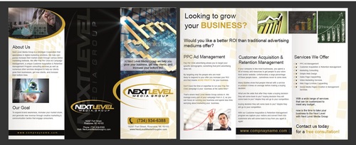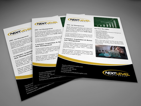 Must have our contact info on the brochure & flyer, preferably on the front page. Also please include our info on any other materials you create for this contest. Contact info is NextLevelMediaGroupInc.com 18297 Fort Street, Riverview, MI. 48193 (734) 934-6388