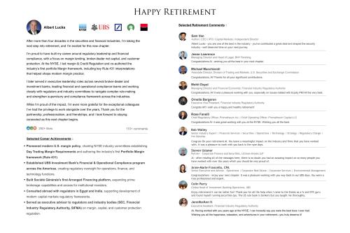 Hi! I am creating a custom retirement gift for my father that will be turned into a physical plaque or framed print. The concept is to recreate a LinkedIn post announcing retirement in a clean, polished design that resembles the LinkedIn interface, but elevated to look plaque-worthy rather than like a simple screenshot. This design will ultimately be printed on a plaque (likely acrylic, glass, or metal) and presented as a retirement gift.