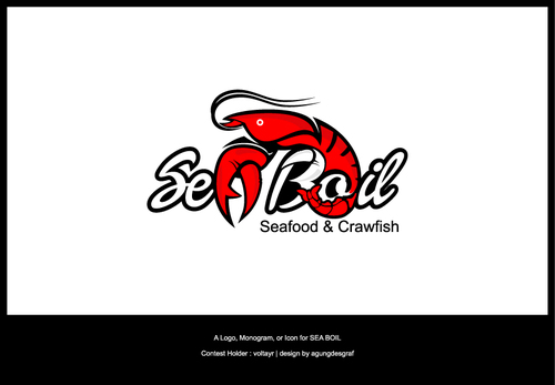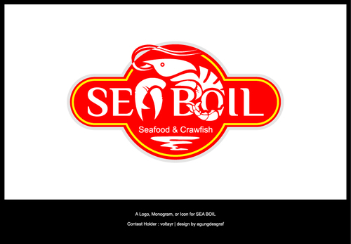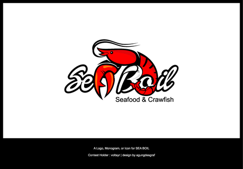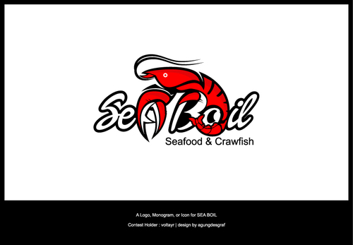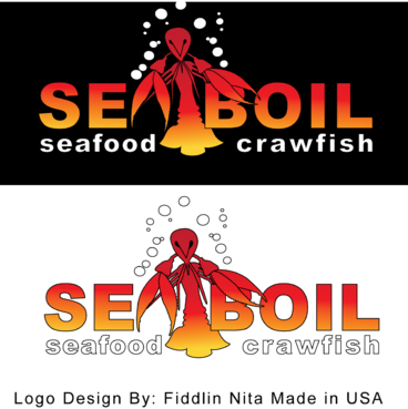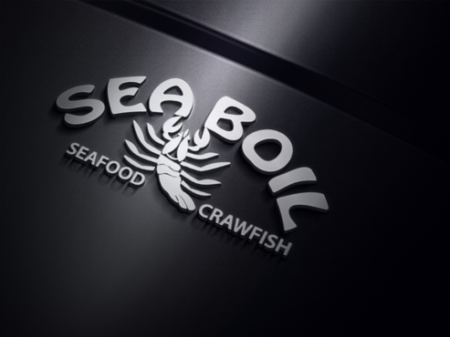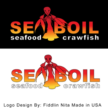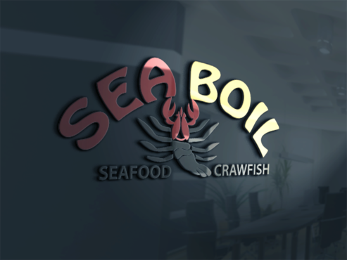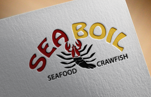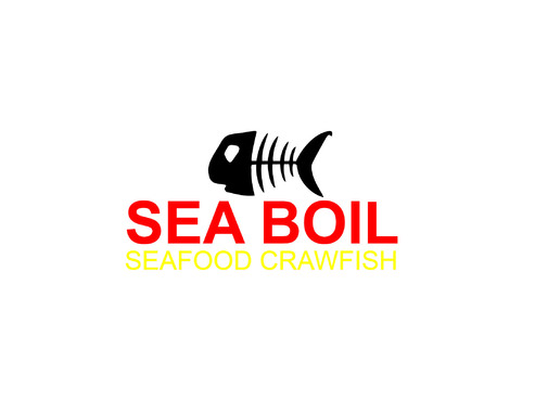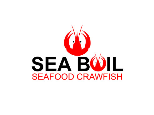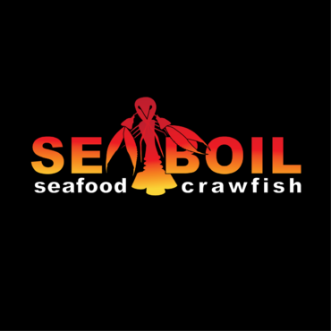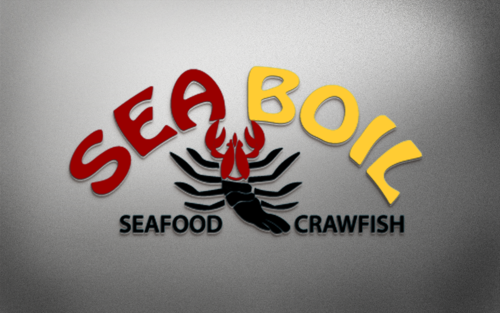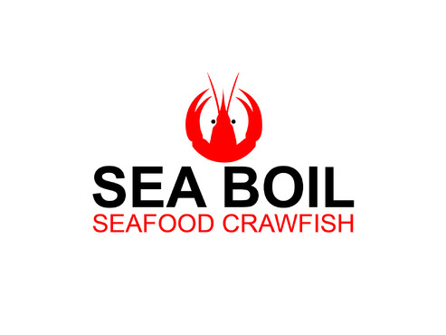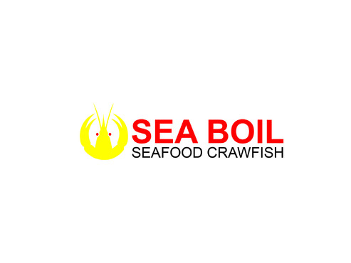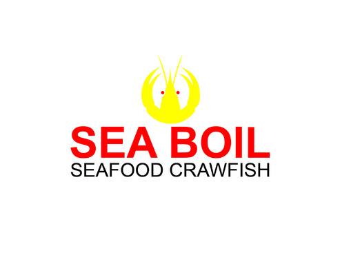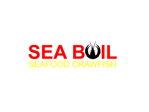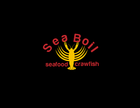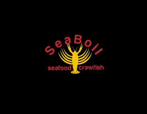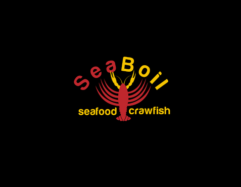we want the word SEA BOIL on top with a crawfish hanging over facing you between the two words... one claw forms the A of SEA and the other claw just hangs on top of B or behind B and O of BOIL the tail should hang between the two words and seafood should be to the left of the tail and crawfish to the right of the tail. colors are Black, Red, and Yellow, keeping vector print in mind so maybe bottom of letters yellow and top of letters red and the tagline letters in white everything stroked in black.